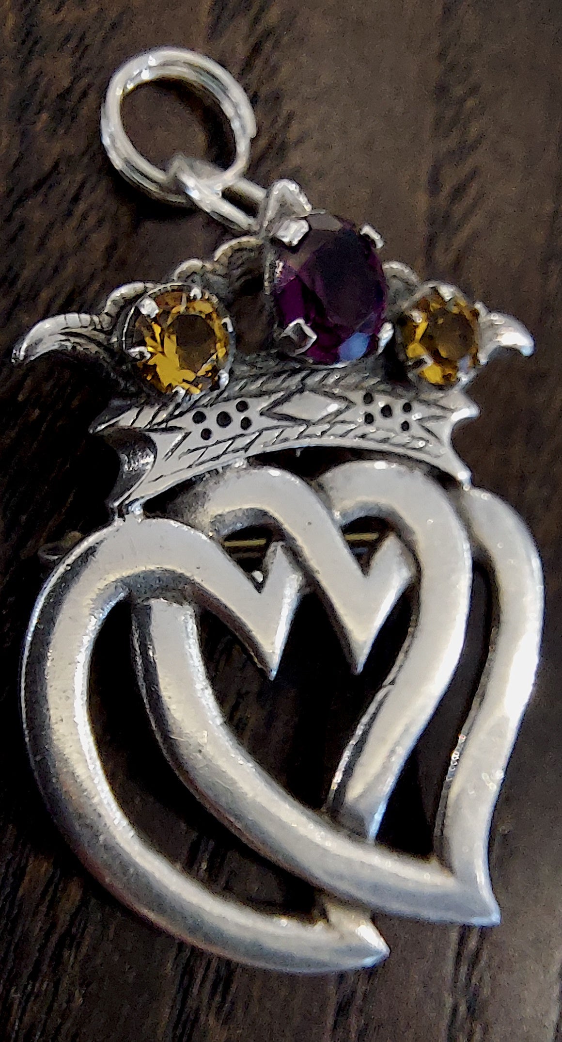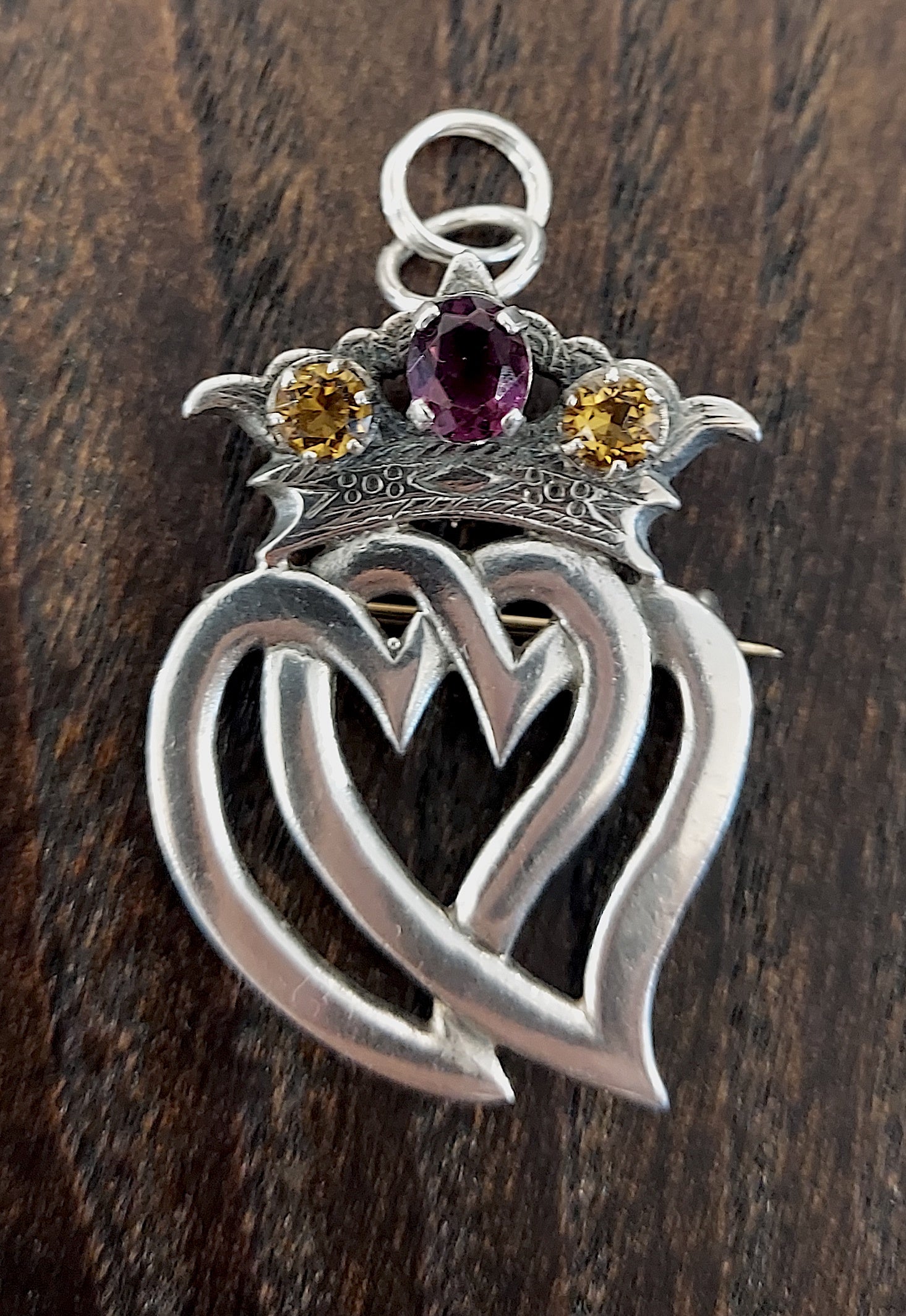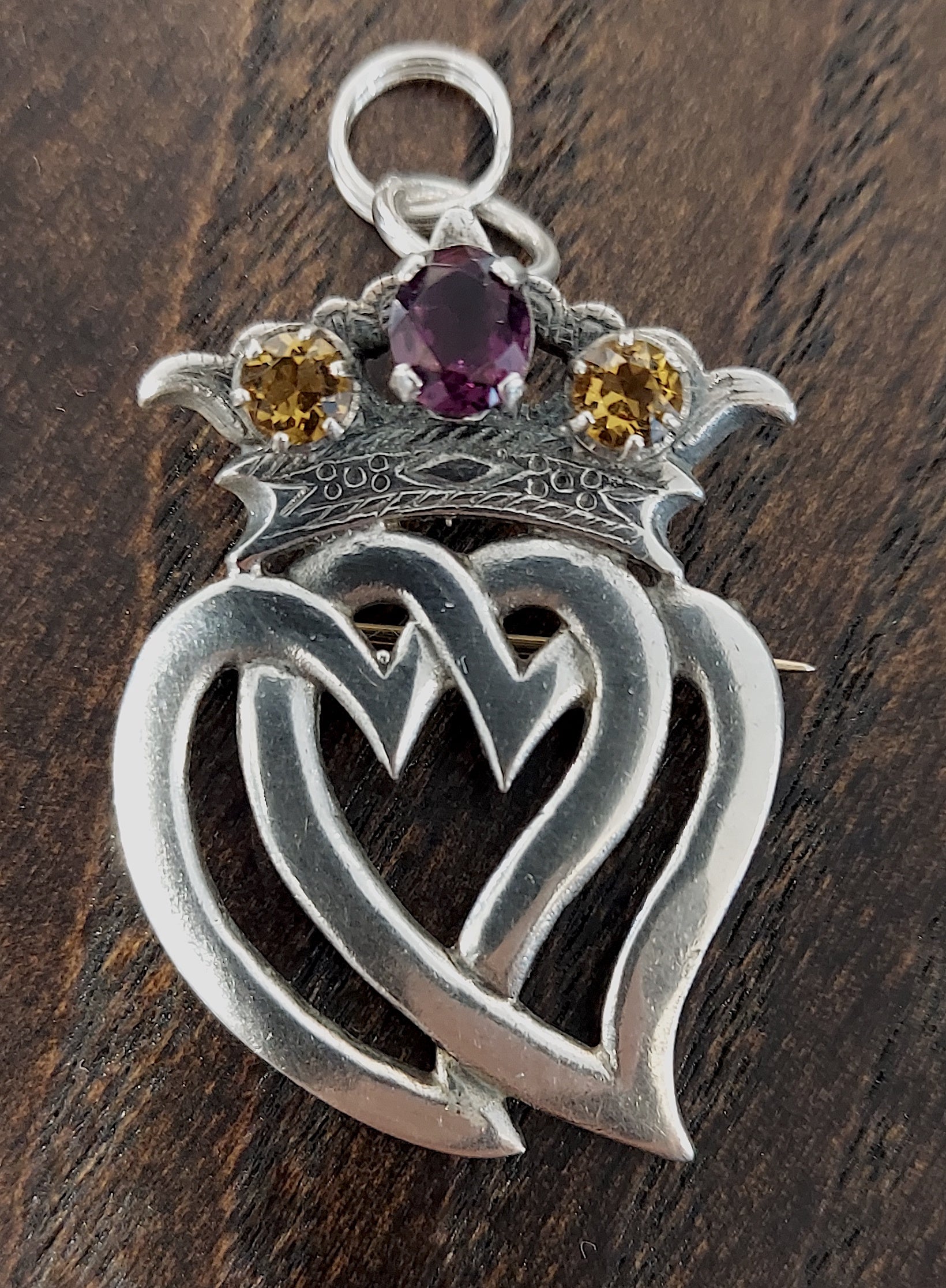 Beautiful sterling silver Scottish Luckenbooth brooch, restored with care and gently brought back to life. Adorned with amethyst & citrine pastes. The brooch is hallmarked for sterling silver, Edinburgh 1954, makers William Scott Peat. Adapted with jump-rings so it may also grace the neck as a pendant.