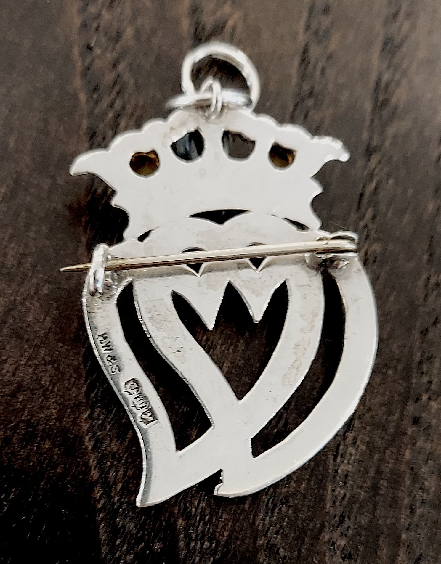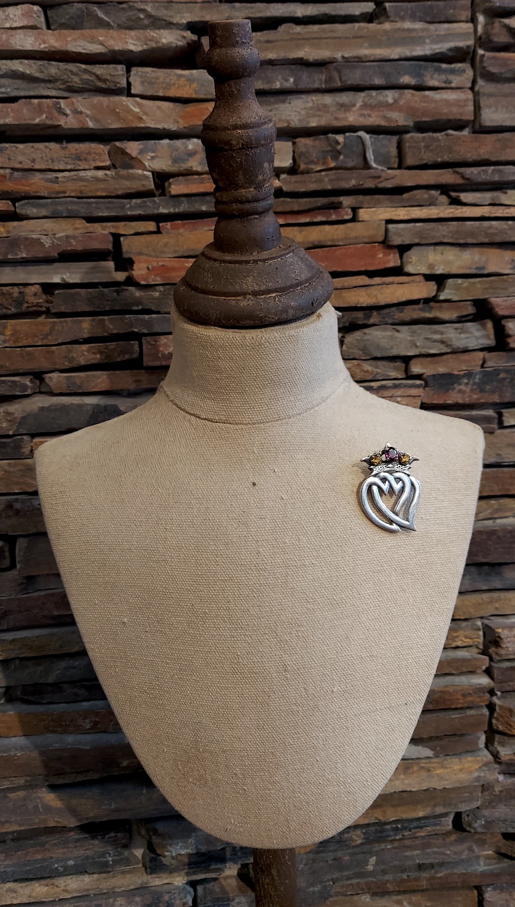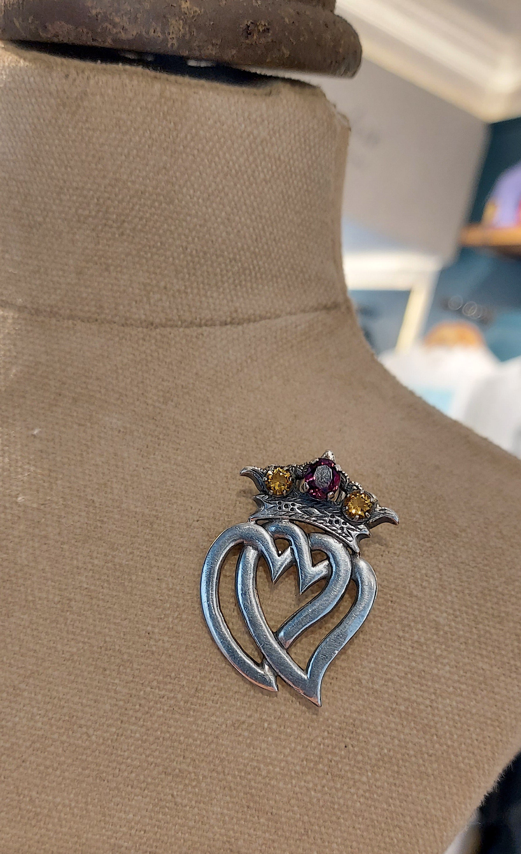 Beautiful sterling silver Scottish Luckenbooth brooch, restored with care and gently brought back to life. Adorned with amethyst & citrine pastes. The brooch is hallmarked for sterling silver, Edinburgh 1954, makers William Scott Peat. Adapted with jump-rings so it may also grace the neck as a pendant.