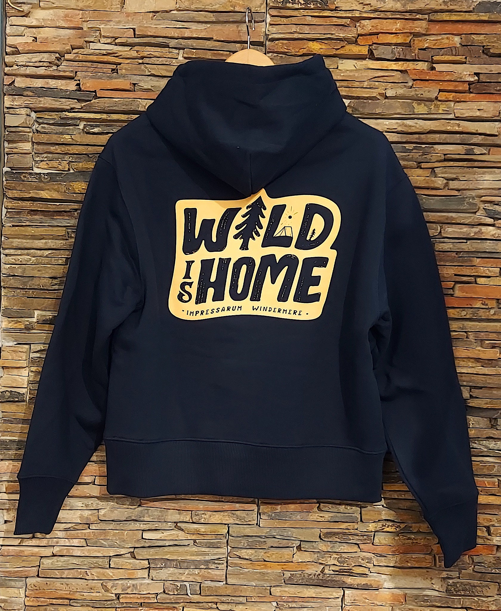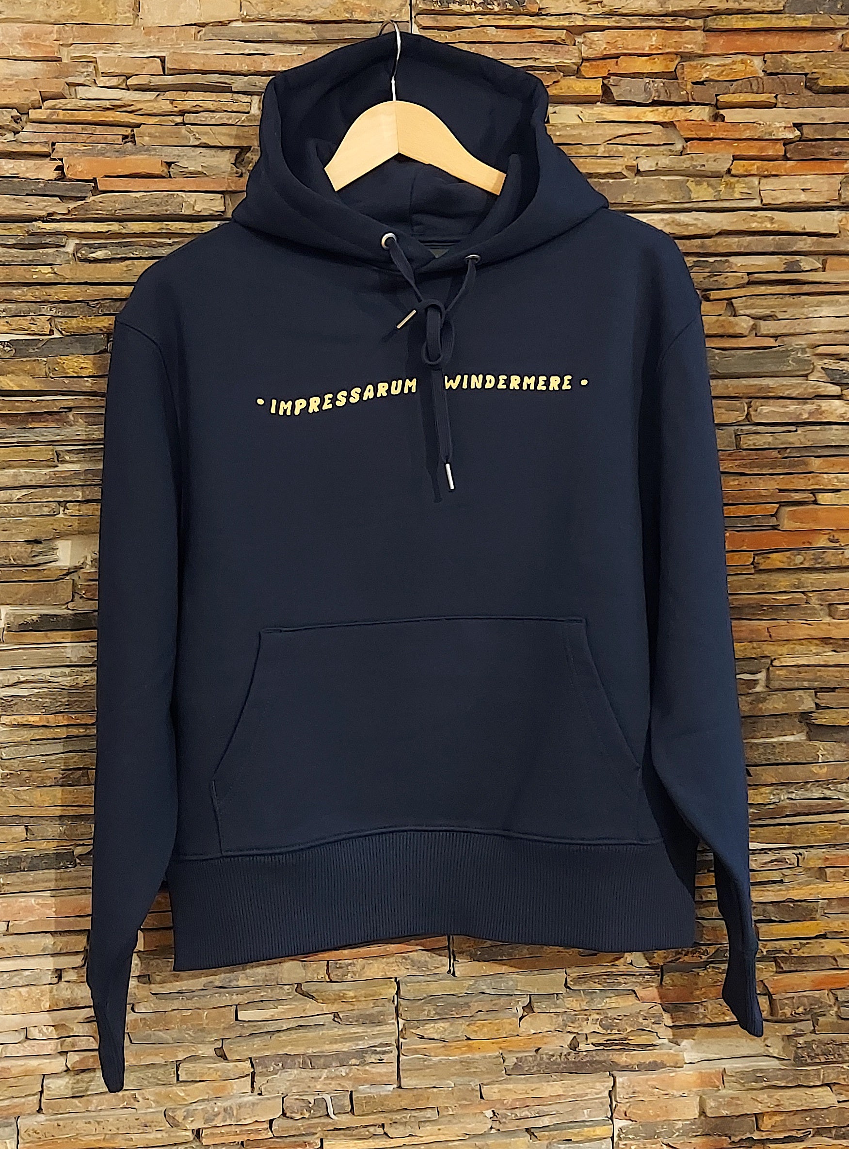Hoodie in navy with our "Wild is Home" design in yellow printed on the reverse and "Impressarum Windermere" on the front. Designed exclusively for Impressarum and screen printed by hand with water based inks, in Cumbria.