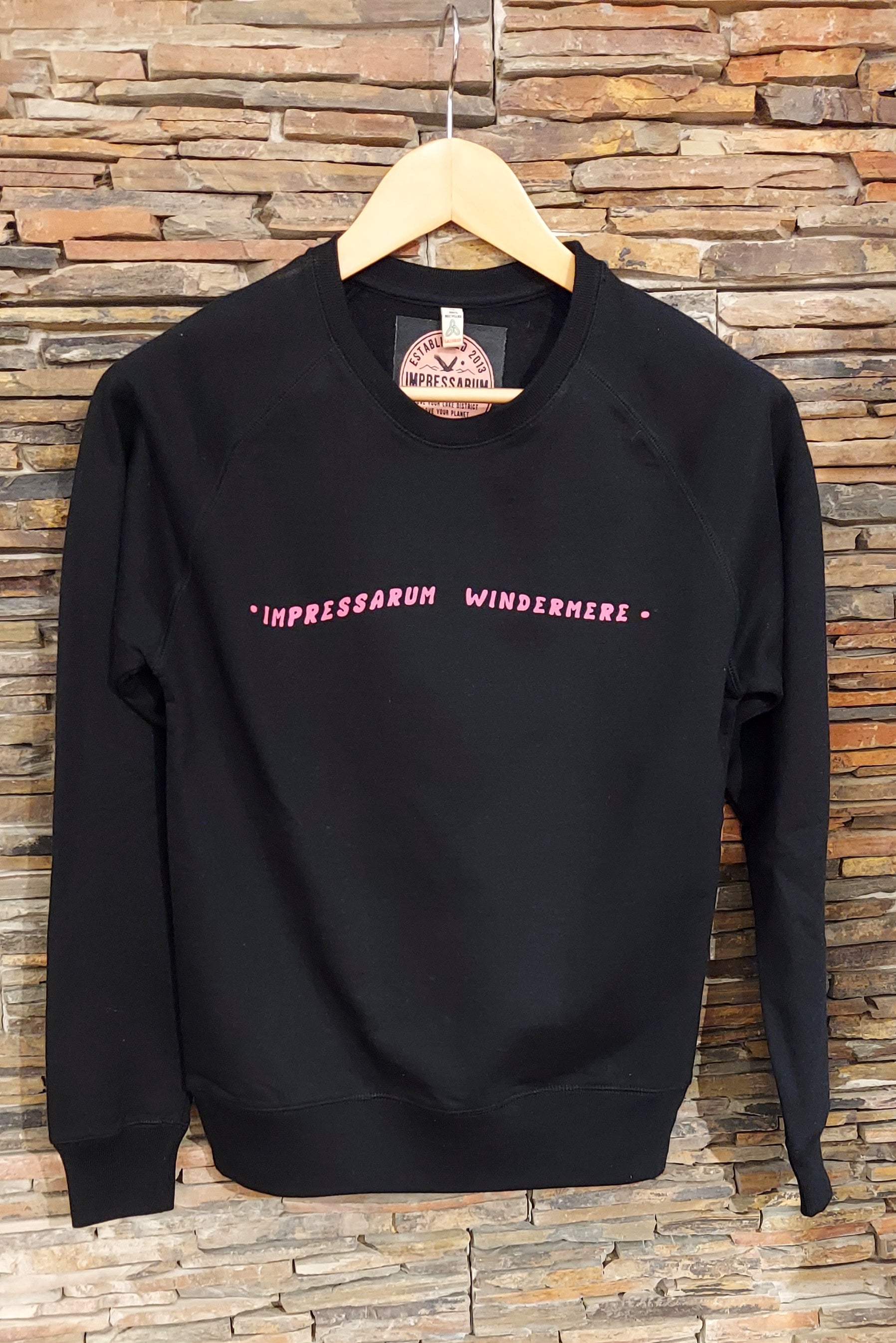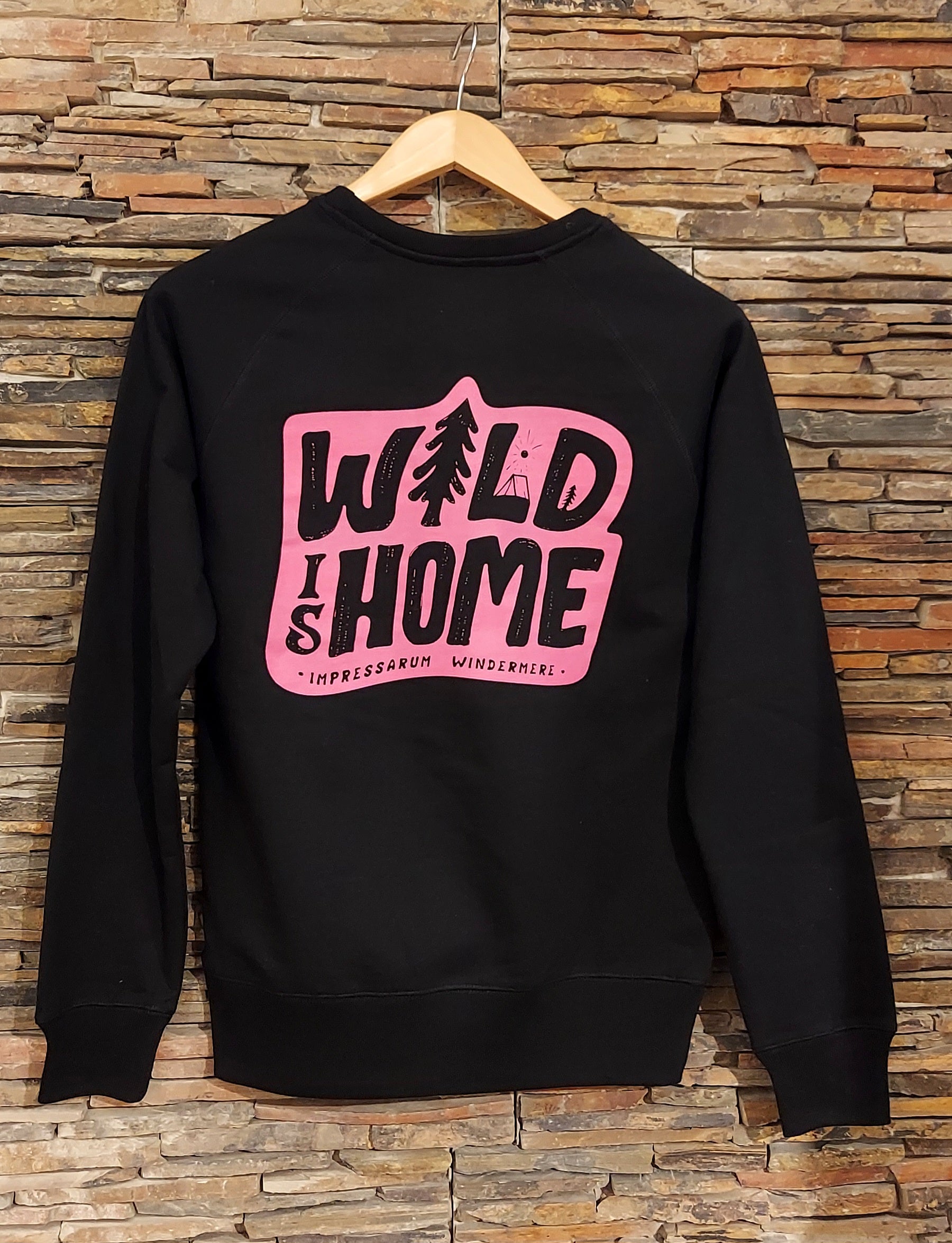 Black unisex recycled raglan sweatshirt with our "Wild is Home" design printed in candy pink. Large main design on reverse, with "Impressarum Windermere" on front.