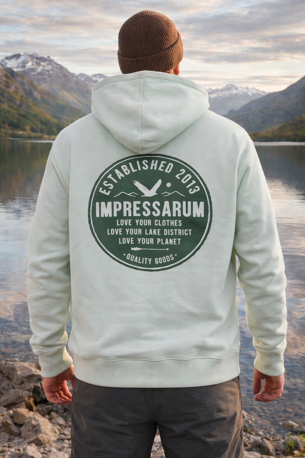 Our classic logo hoodie in Stem Green with olive print. Designed exclusively for Impressarum and screen printed by hand with water based inks, in Cumbria.