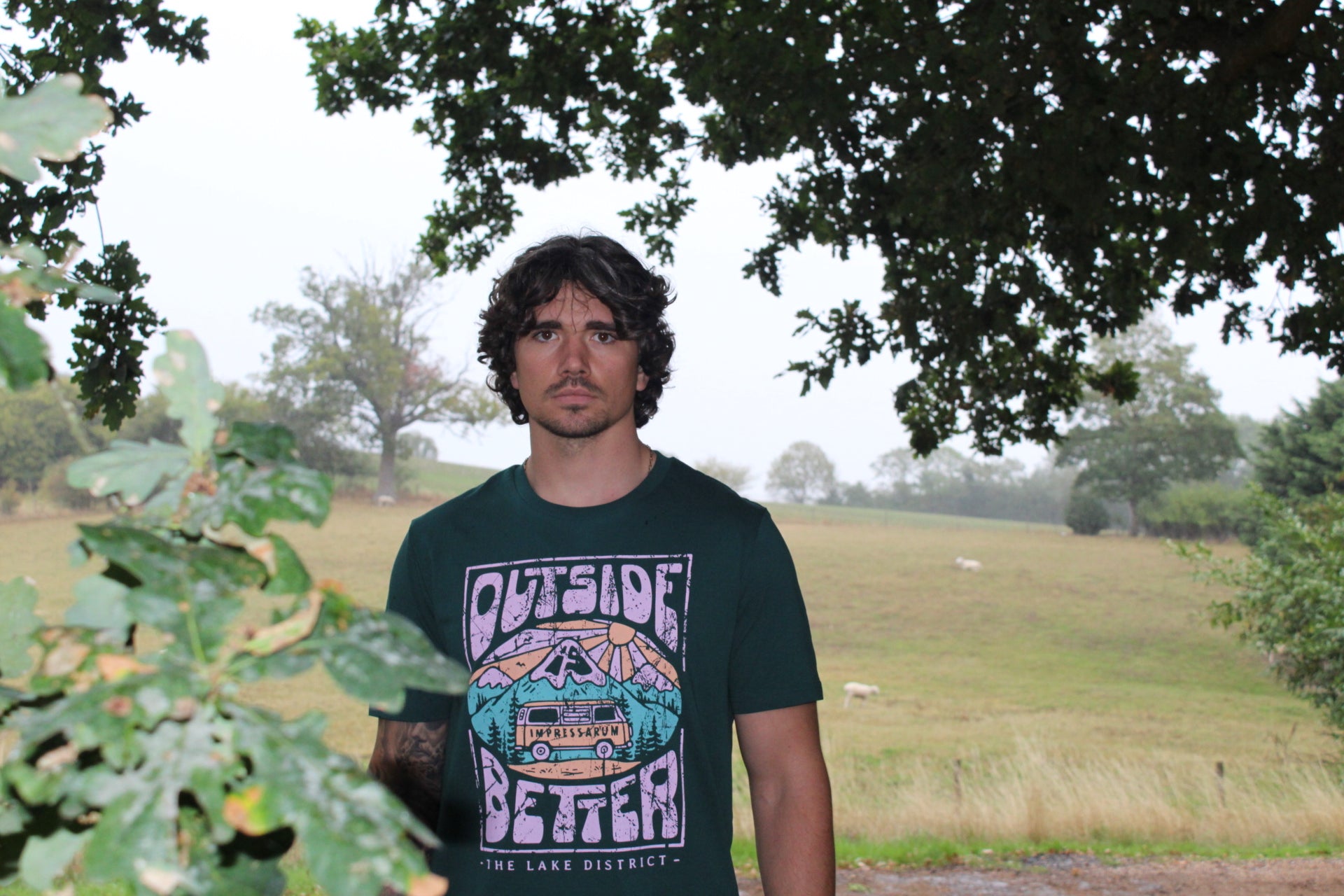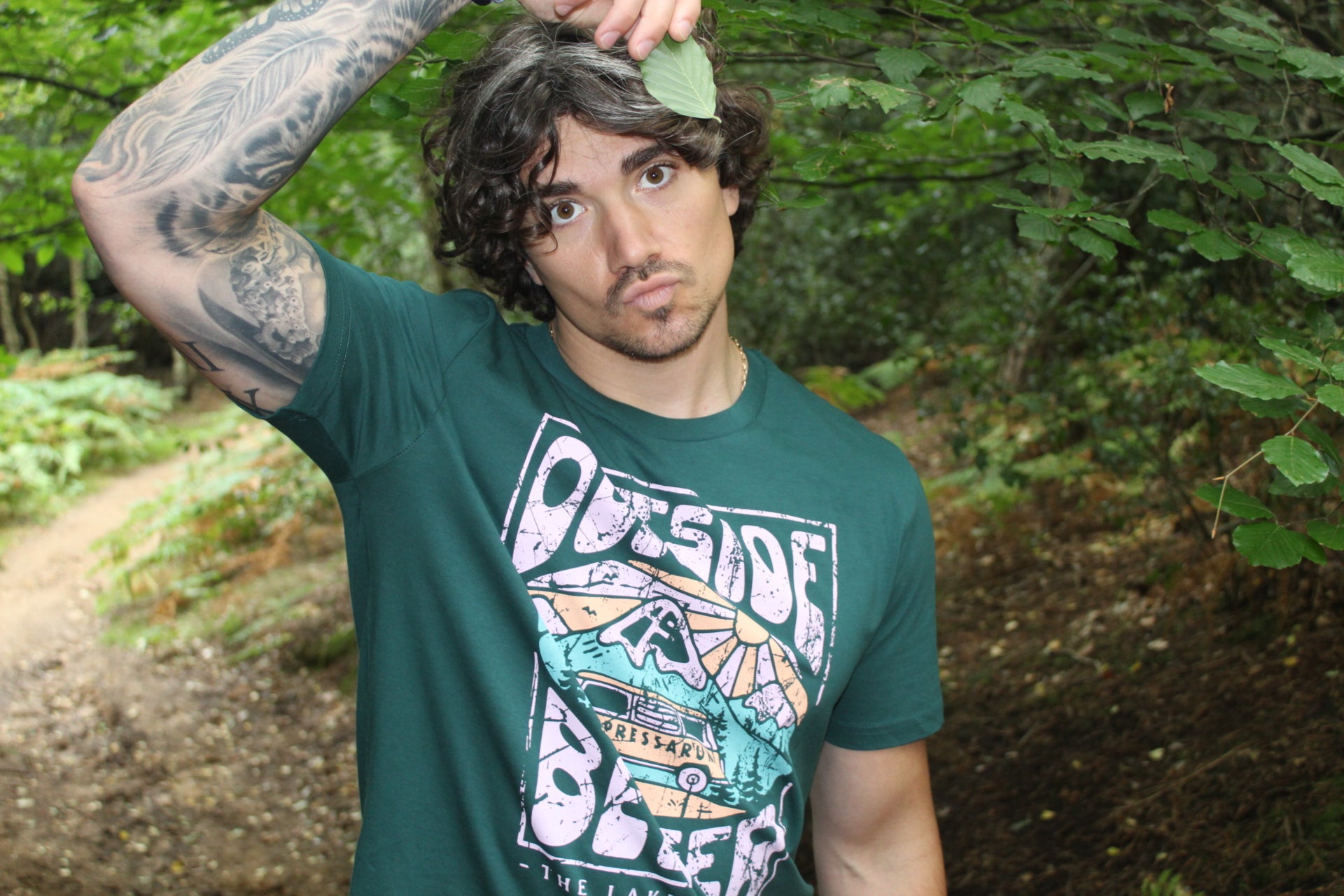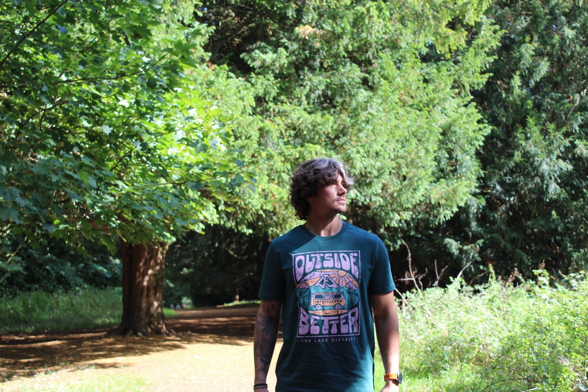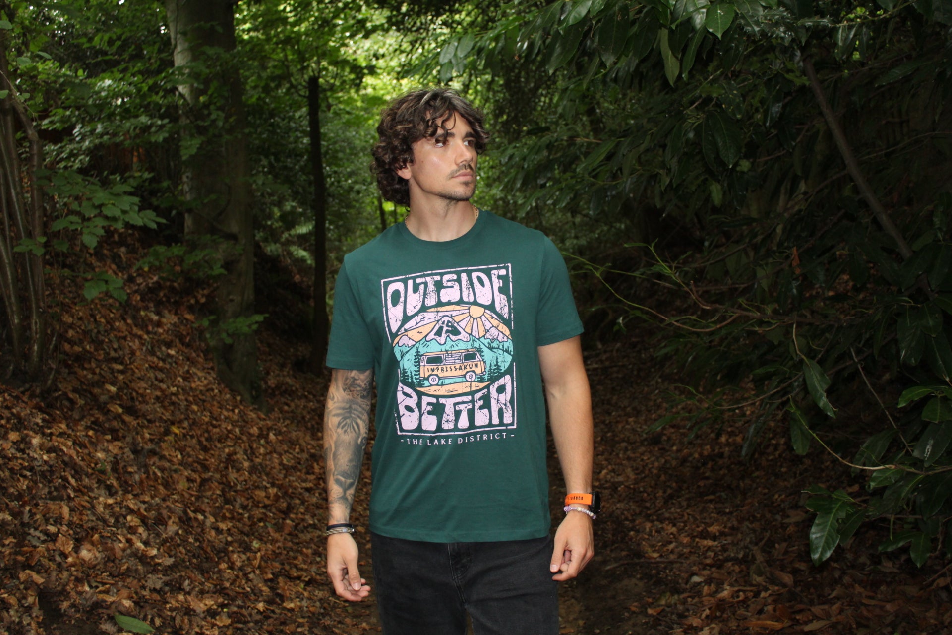 A beautifully soft organic glazed green men's t-shirt with our "Outside is Better" vintage inspired design.
