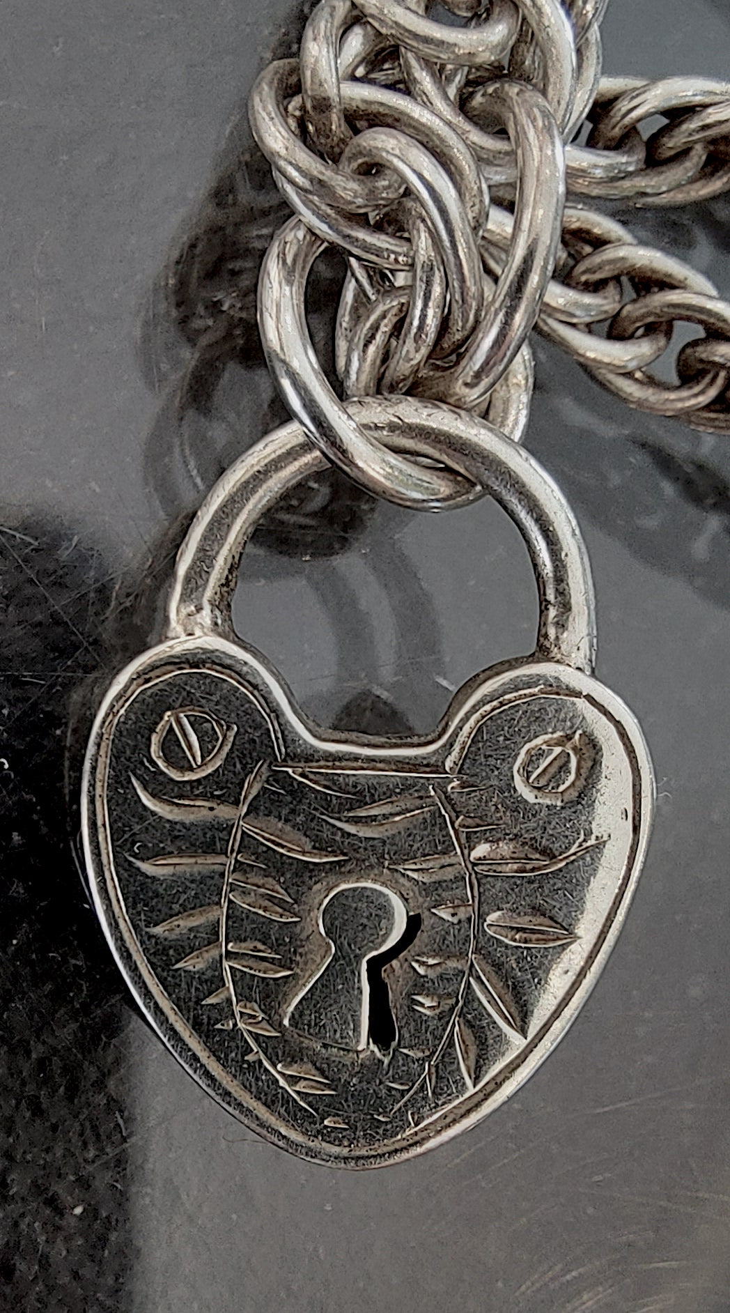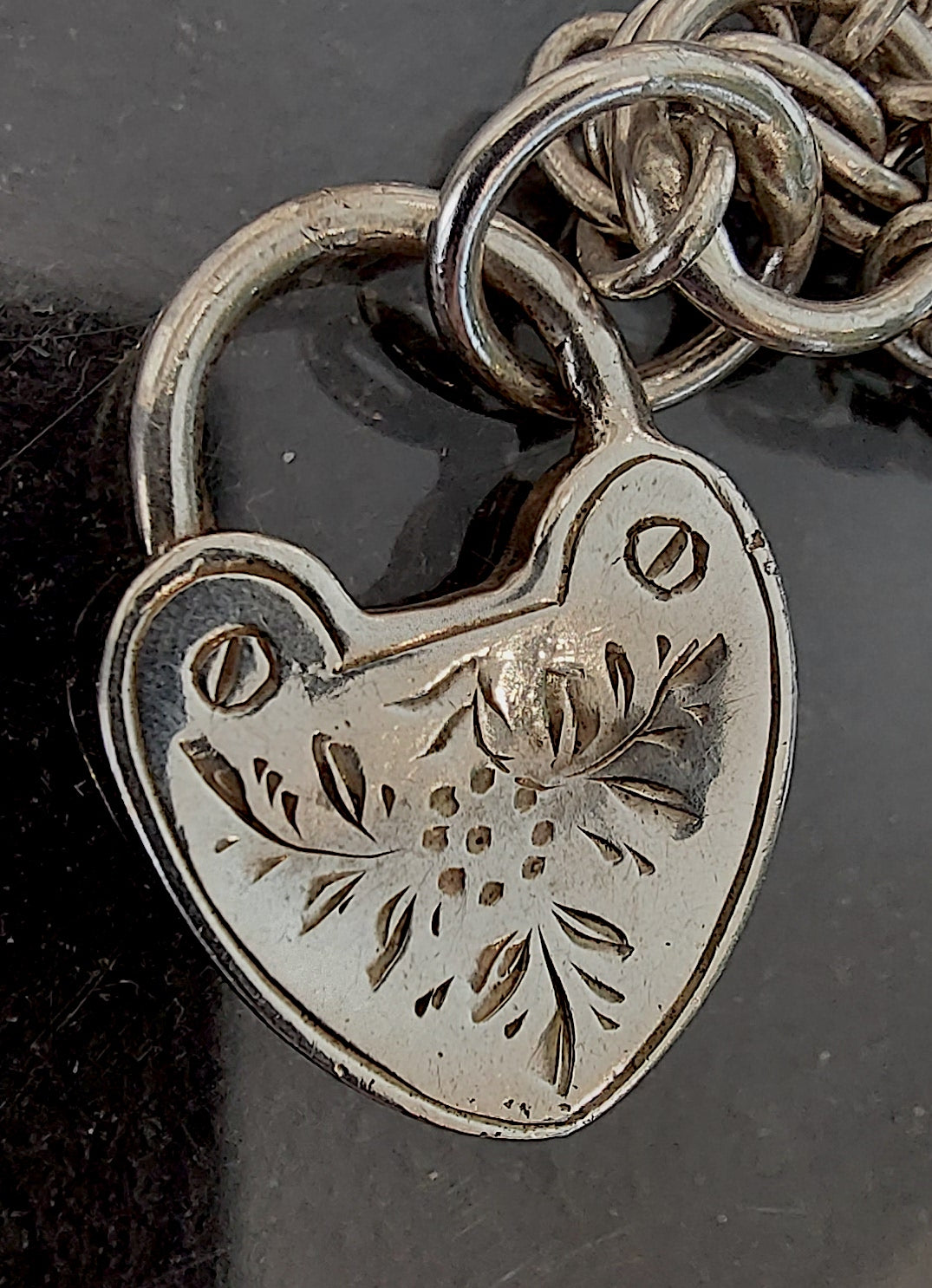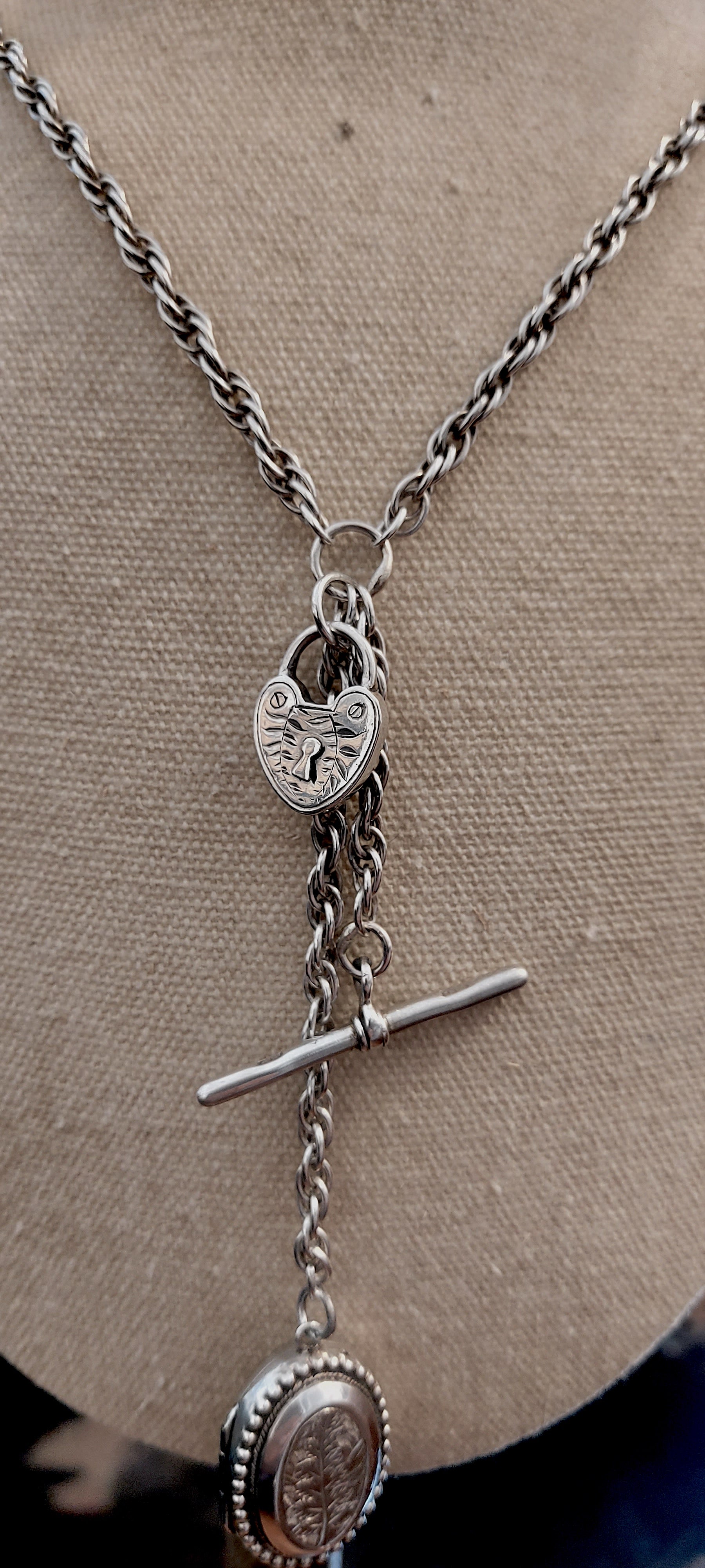 This striking necklace is re-crafted from vintage and antique silver elements. A bold rope style chain meets a classic T-bar drop hallmarked 1870. A Victorian heart padlock (this does not open, it is a solid charm,) together with the crowning glory of an intricately engraved Victorian locket pendant. The locket’s raised foliate motif, framed with a beaded edge, hints at something secret and timeless — a keepsake of love or memory. Opens and closes securely with a satisfying click. There is a tiny crack inside as can be seen in open locket photo, but this doesn't distract from the beauty of it at all. The locket measures 25mm excluding the bale.