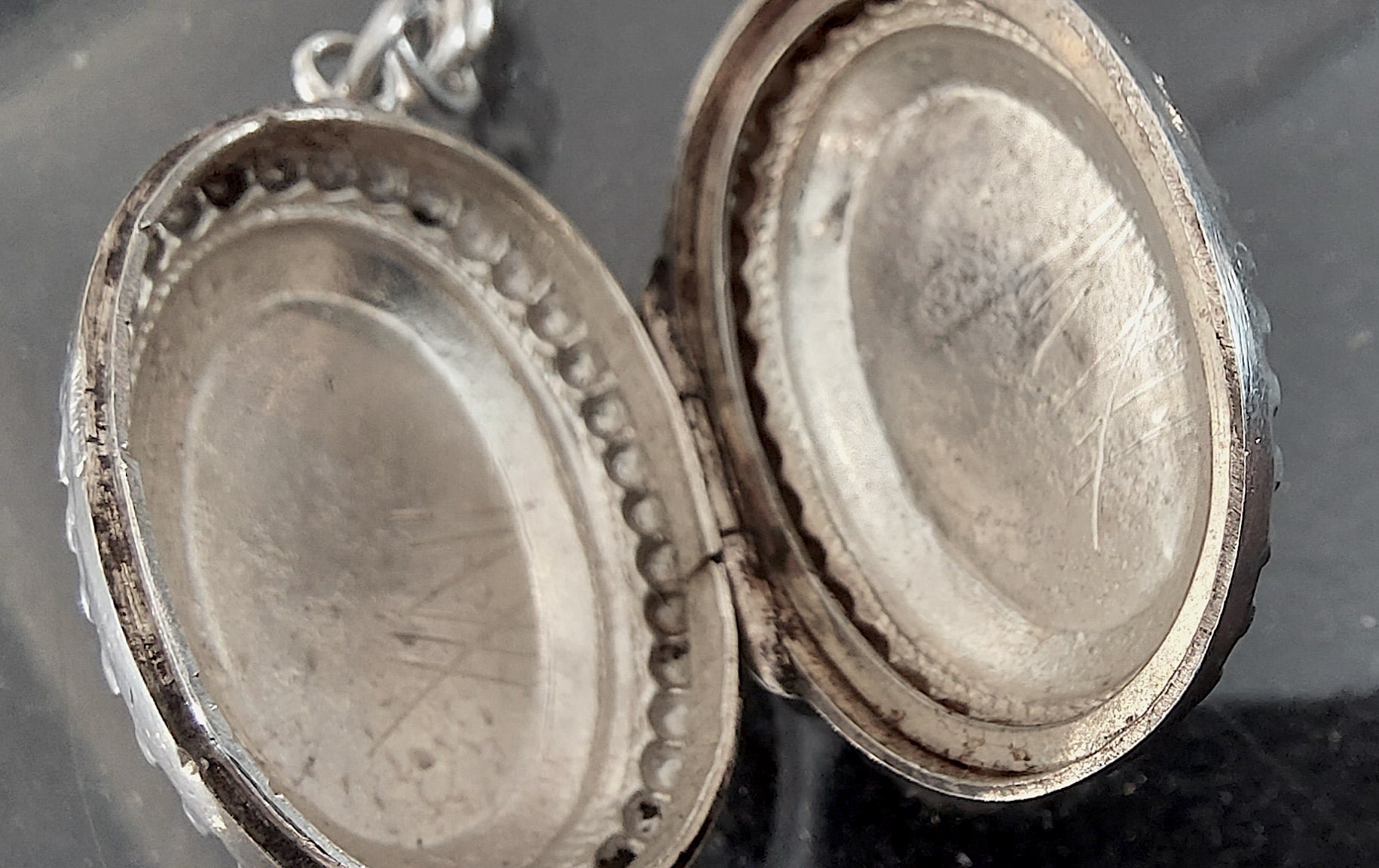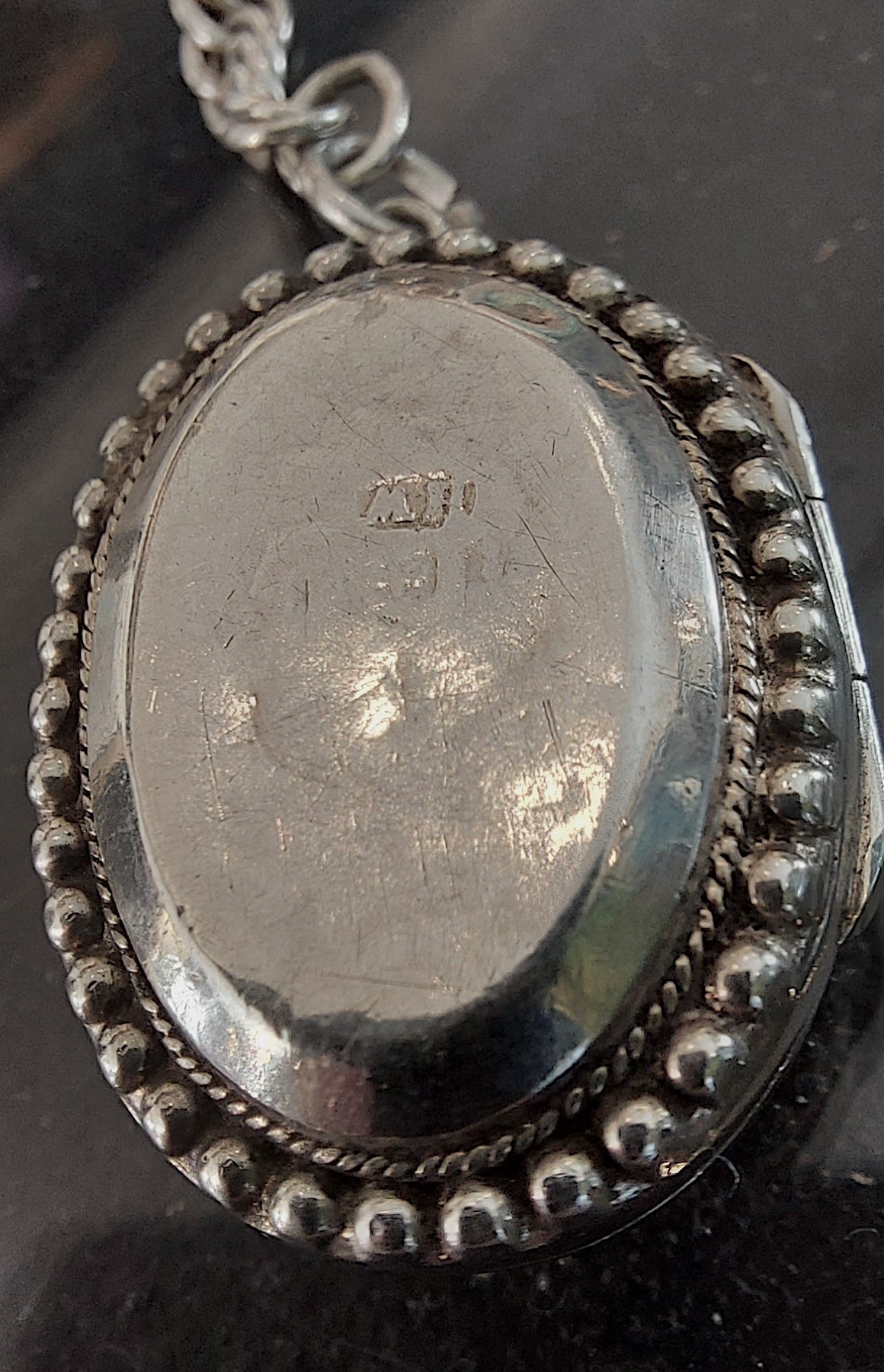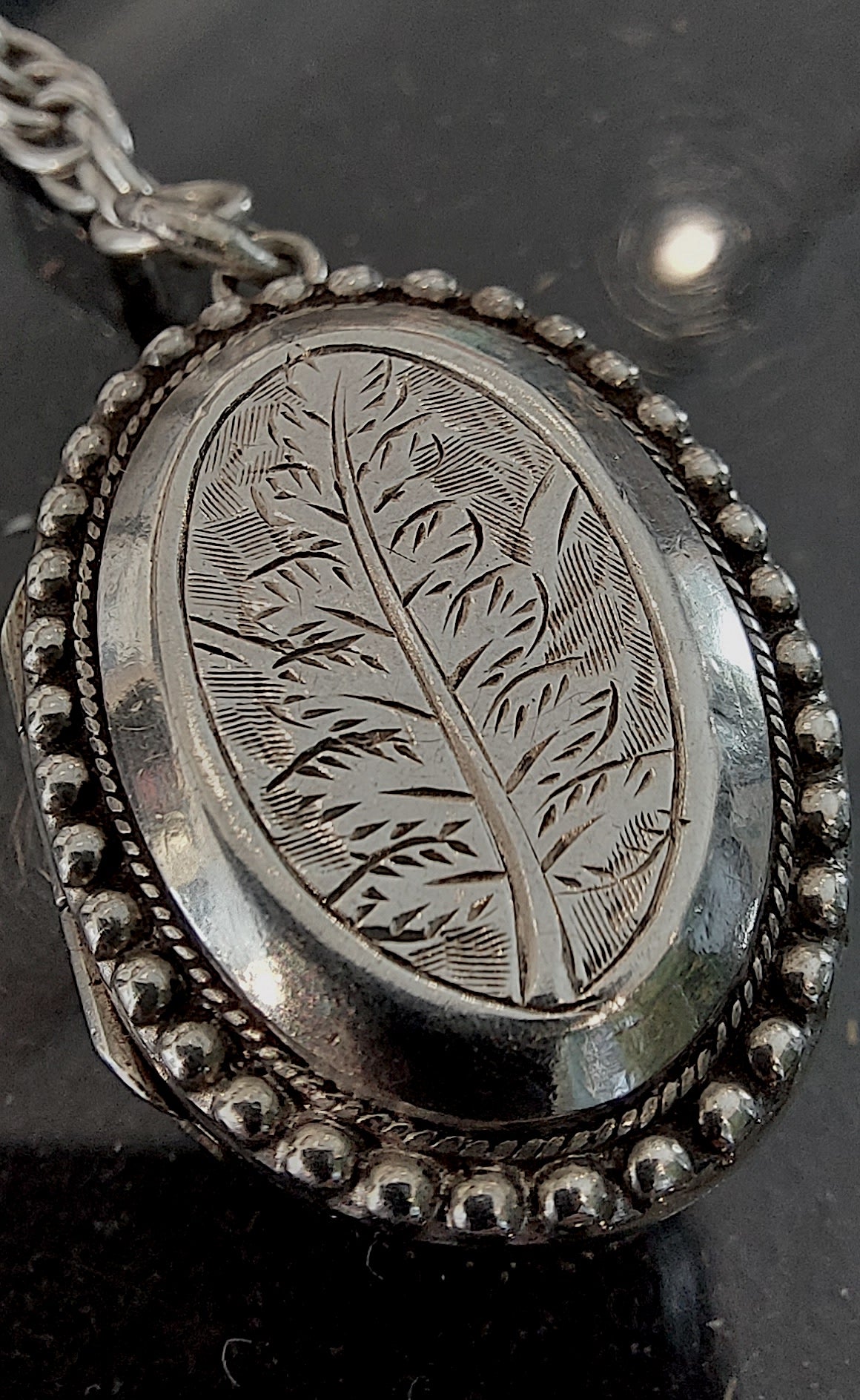 This striking necklace is re-crafted from vintage and antique silver elements. A bold rope style chain meets a classic T-bar drop hallmarked 1870. A Victorian heart padlock (this does not open, it is a solid charm,) together with the crowning glory of an intricately engraved Victorian locket pendant. The locket’s raised foliate motif, framed with a beaded edge, hints at something secret and timeless — a keepsake of love or memory. Opens and closes securely with a satisfying click. There is a tiny crack inside as can be seen in open locket photo, but this doesn't distract from the beauty of it at all. The locket measures 25mm excluding the bale.