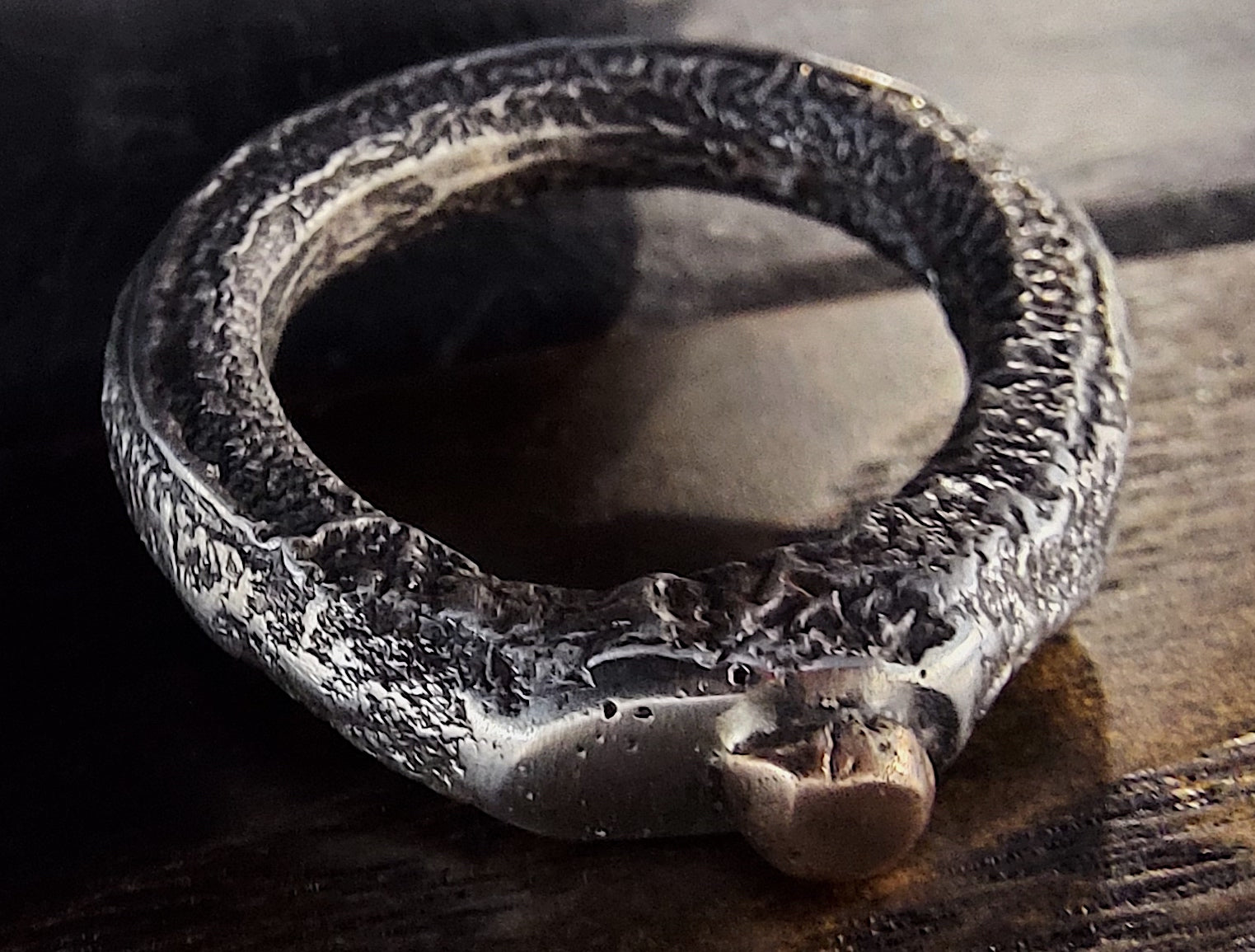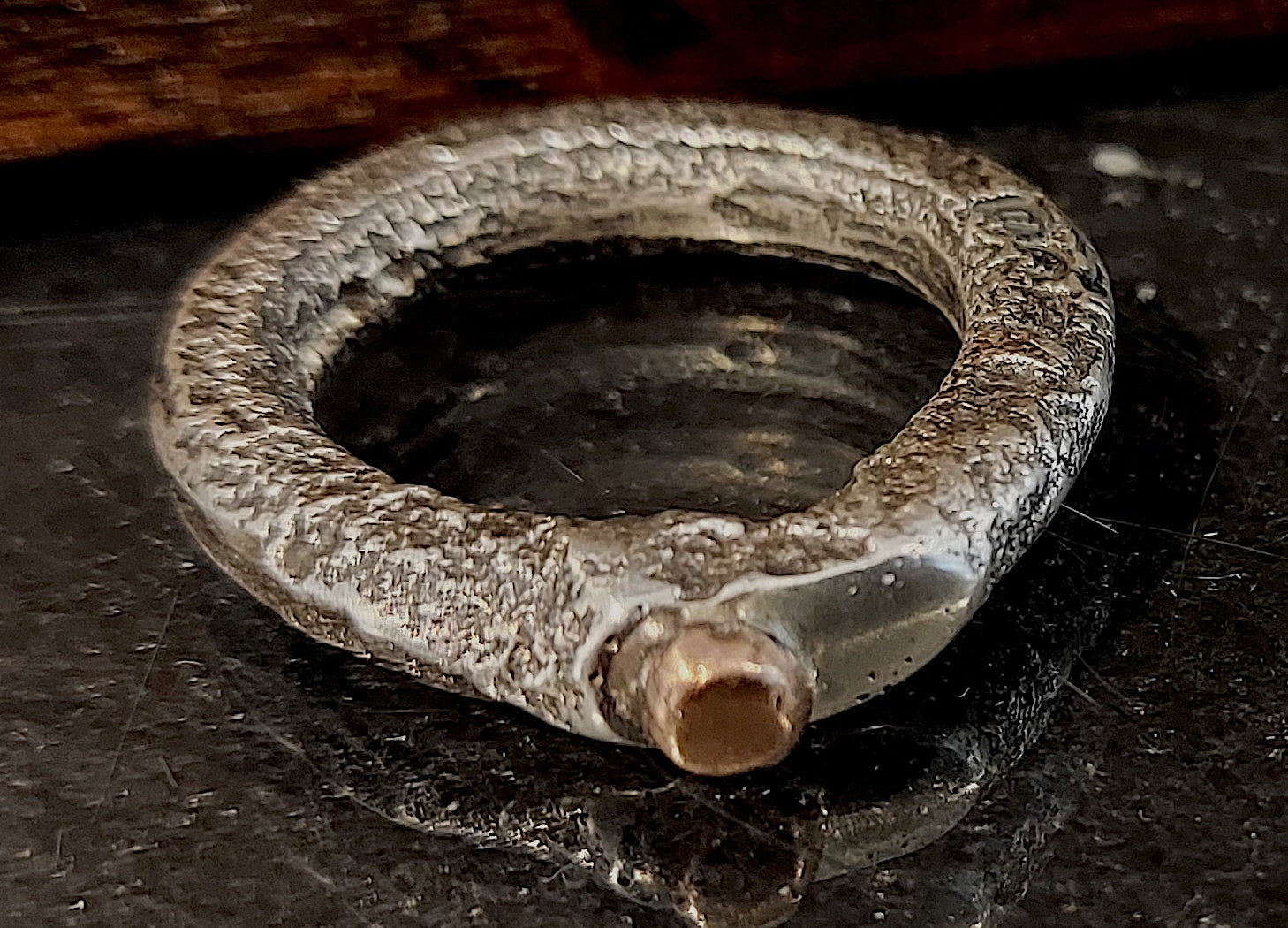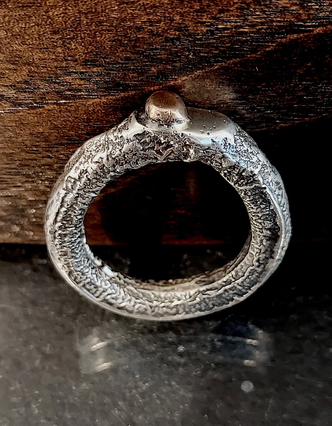 This is a sterling silver & 9K gold, one of a kind, chunky, dystopian style handcrafted ring. Created by reticulating & fusing scrap silver & gold together. Made from 100% recycled silver & gold, (equal in quality to un-recycled silver & gold.) The ring has a post-apocalyptic, rugged, melted and eroded texture and is oxidised to give the texture depth. Expect inconsistencies, the ring is purposefully not as perfectly round as a machine made, mass produced ring might be... it is lovingly crafted by hand to be beautifully rustic, organic and raw! The ring is a size R & weighs 12g. Fully hallmarked AWTS (Away with the spoon,) 925, the lion passant, Sheffield Assay office, A for 2025.