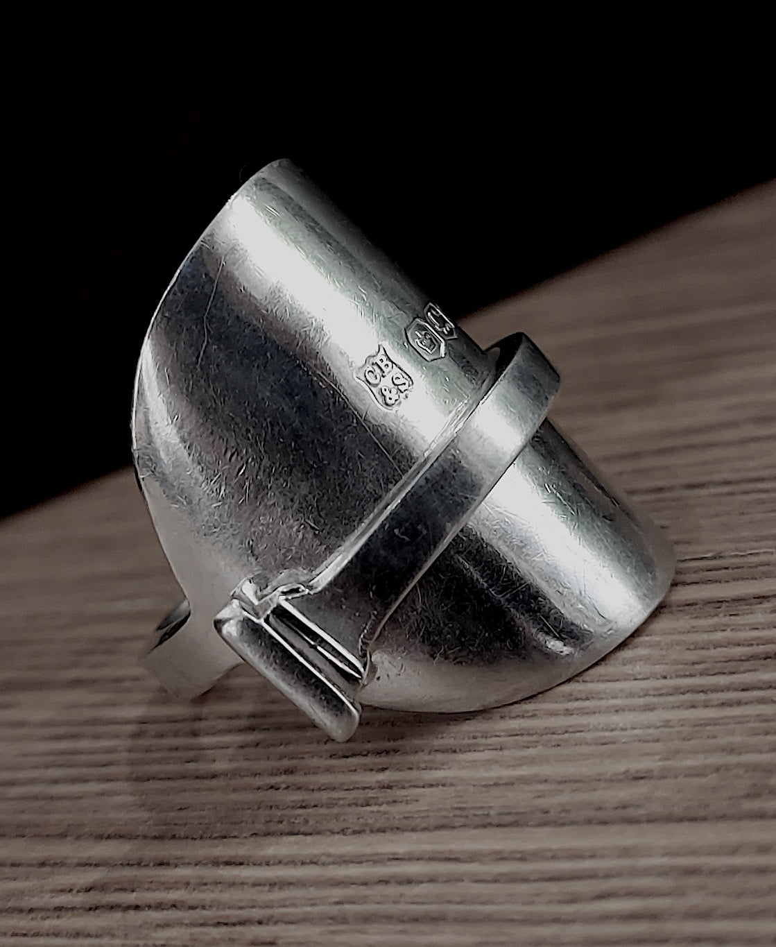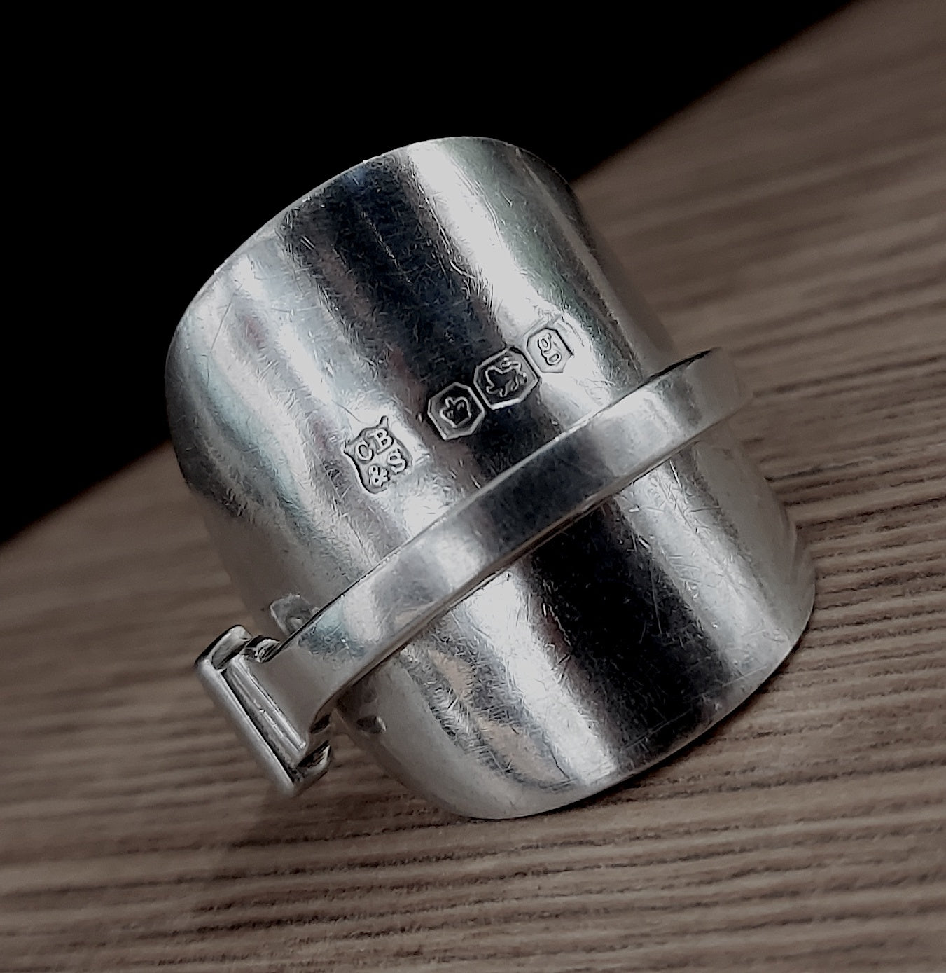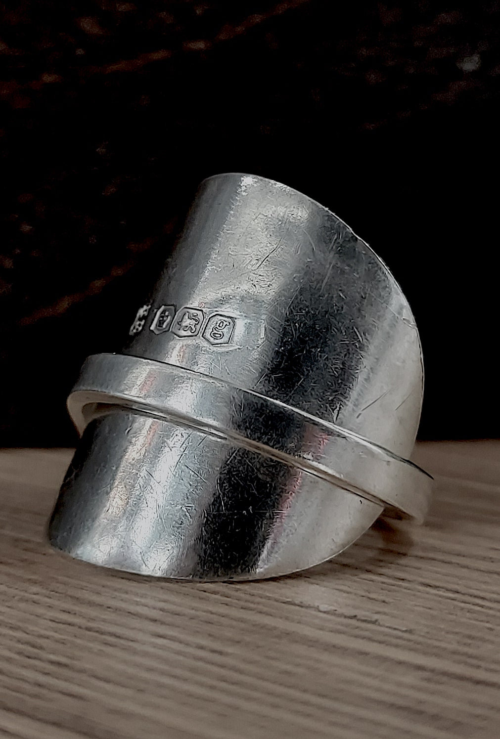 Re-crafted from a solid silver spoon. Hallmarked makers Cooper Brothers, Sheffield 1924 & now also re-assayed and hallmarked AWTS (Away with the spoon,) 925, the lion passant, Sheffield Assay office, A for 2025; so that the piece complies with Section 4 of the Hallmarking Act 1973.