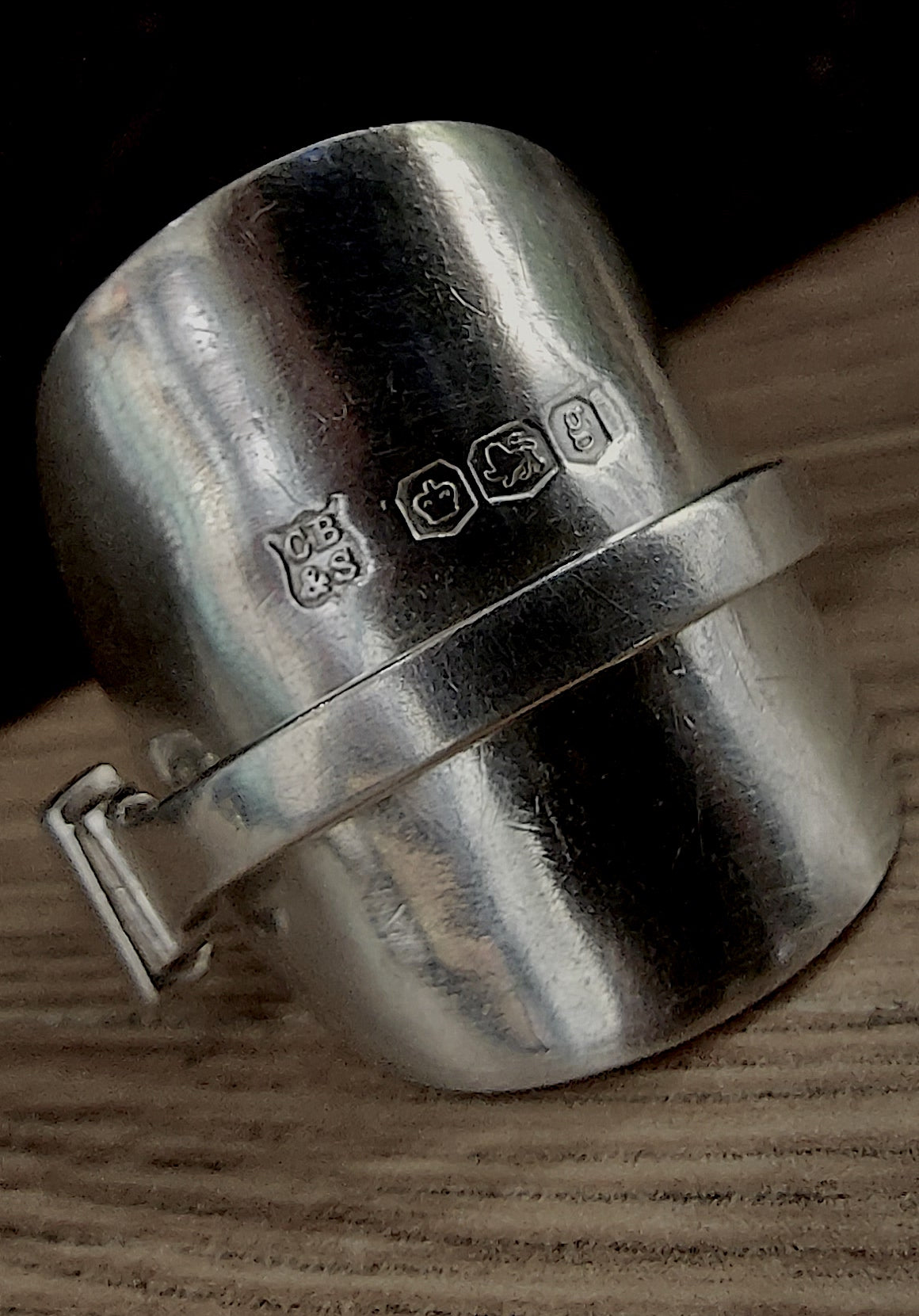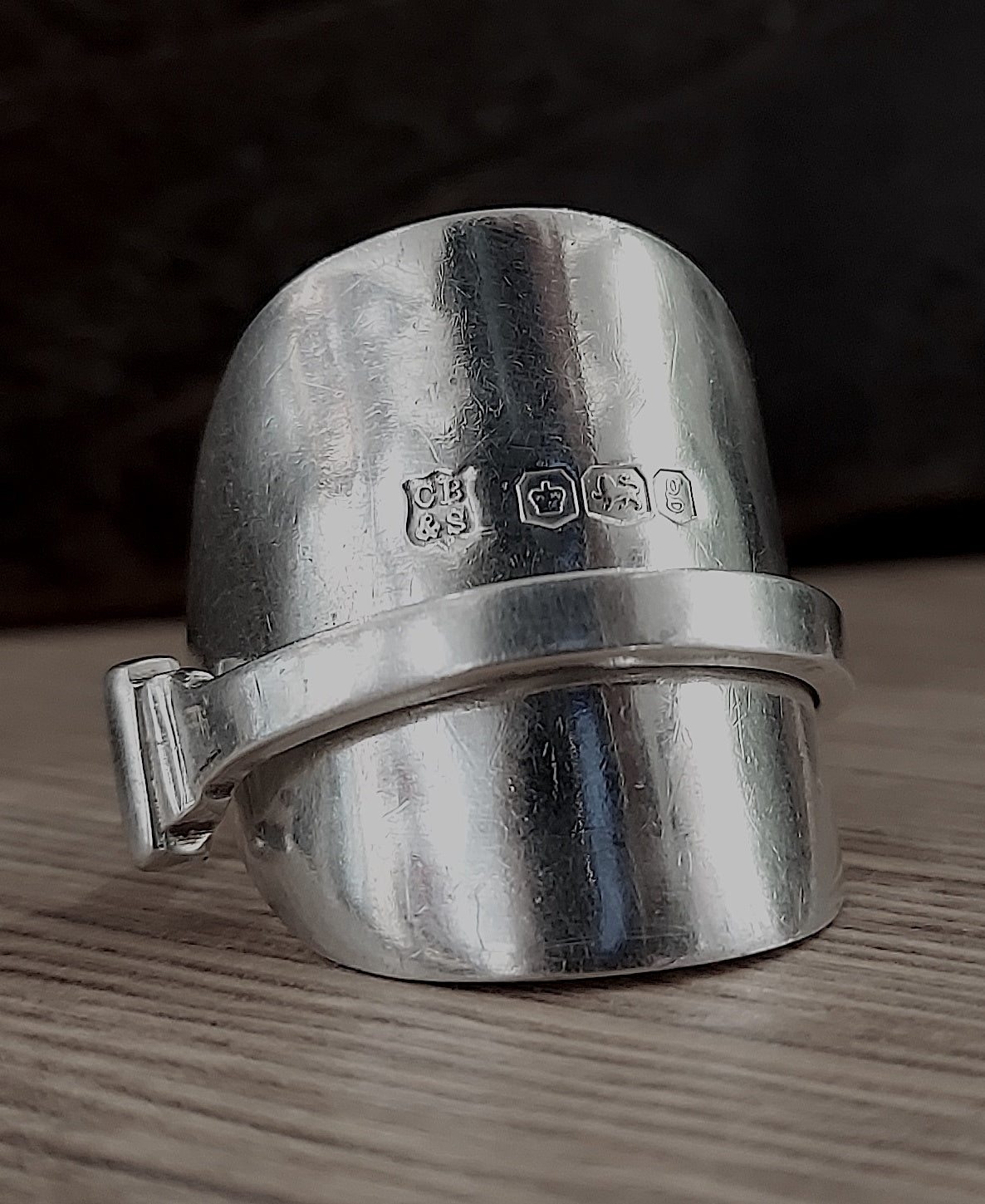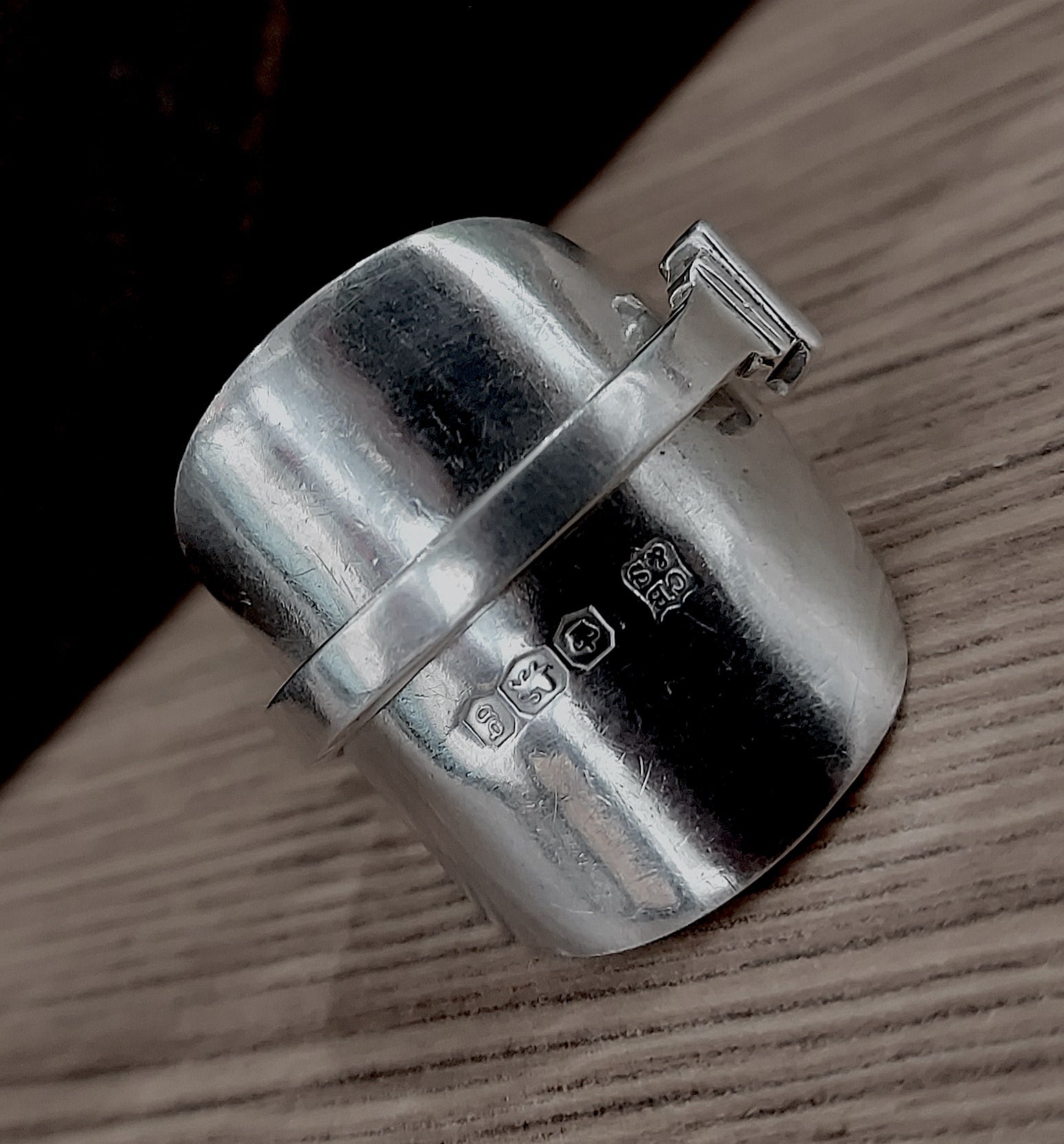 Re-crafted from a solid silver spoon. Hallmarked makers Cooper Brothers, Sheffield 1924 & now also re-assayed and hallmarked AWTS (Away with the spoon,) 925, the lion passant, Sheffield Assay office, A for 2025; so that the piece complies with Section 4 of the Hallmarking Act 1973.