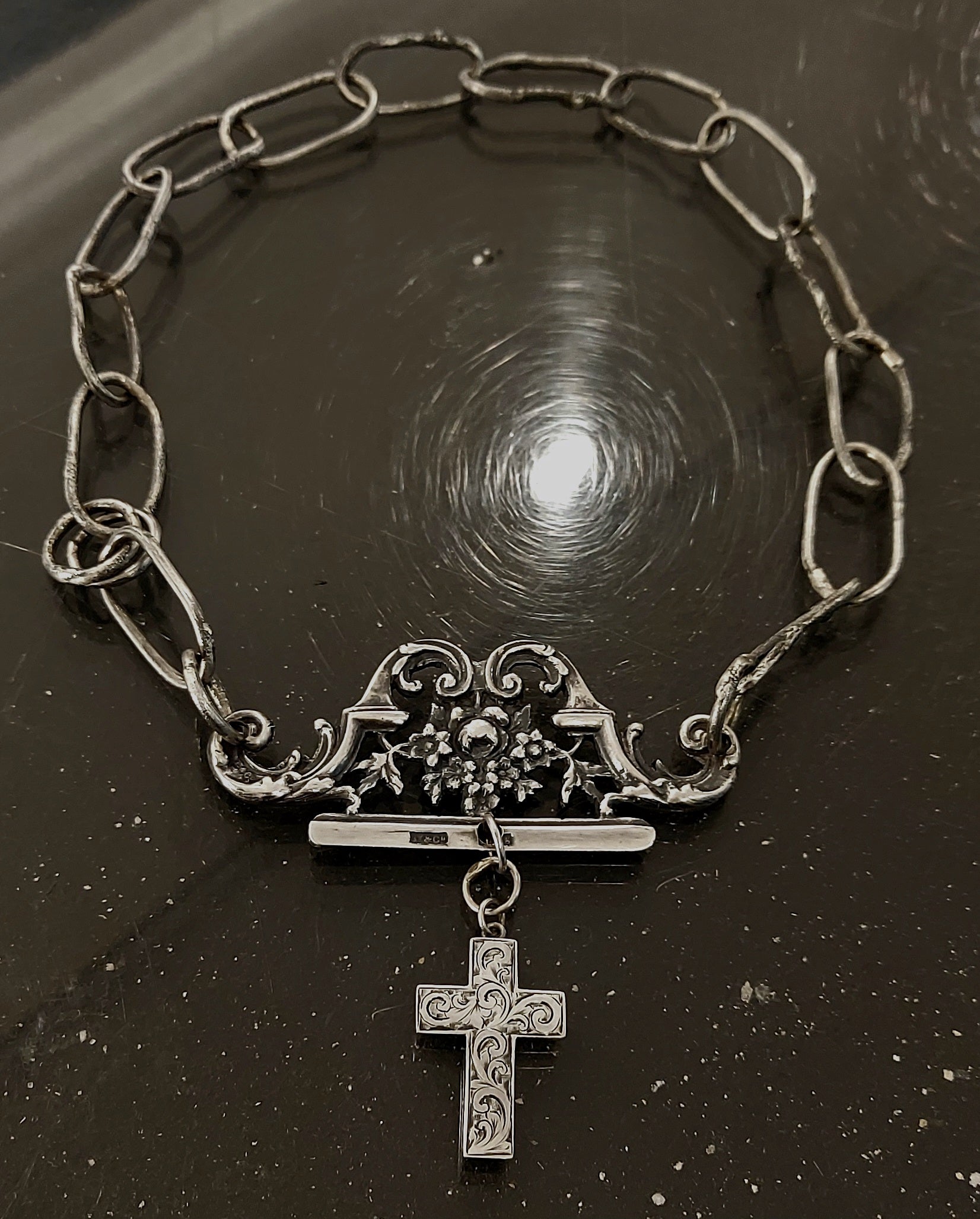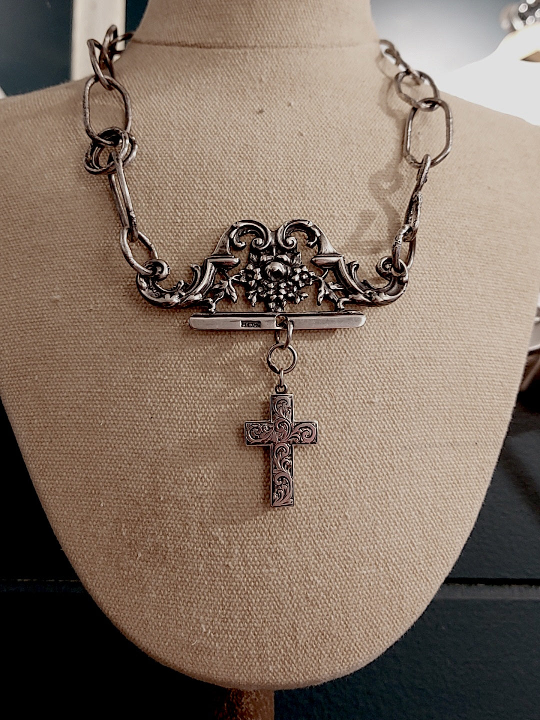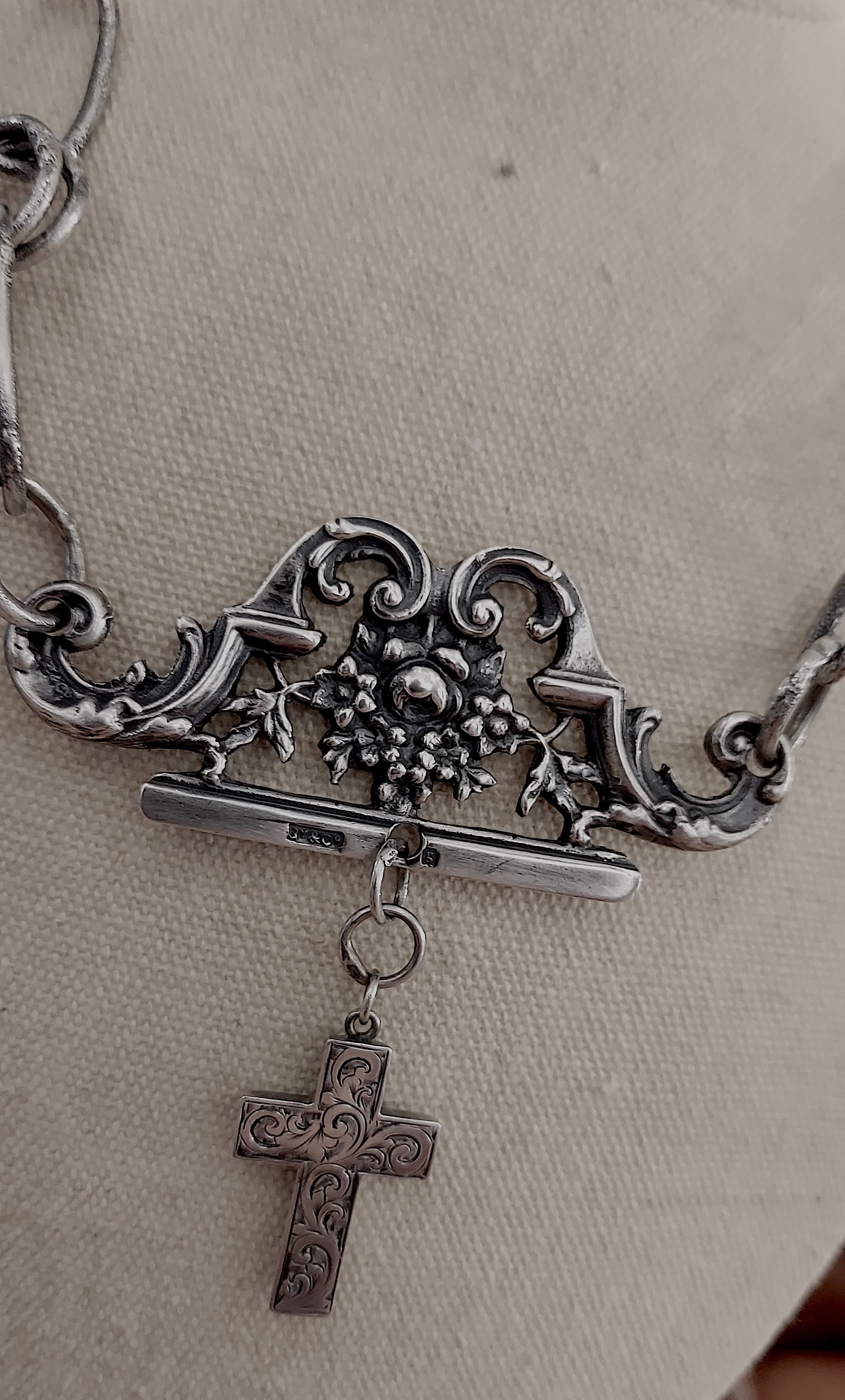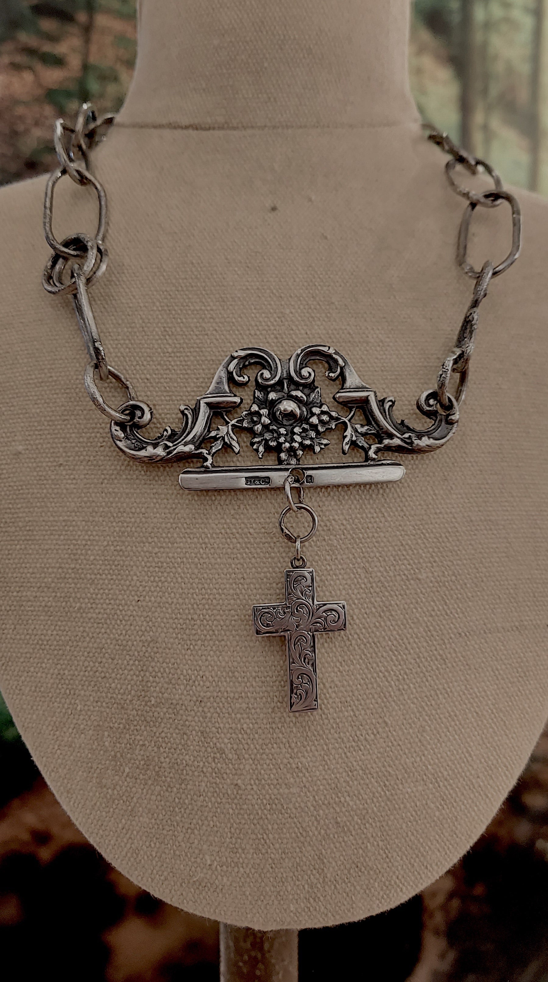 The centrepiece is an ornate, baroque style sterling silver panel, rich with swirling gothic scrollwork and floral detailing, reminiscent of an antique altar ornament. The silver is taken from an antique menu holder, hallmarked Birmingham 1906. Suspended from its hallmarked bar hangs a beautifully detailed cross pendant, hallmarked Chester 1902.