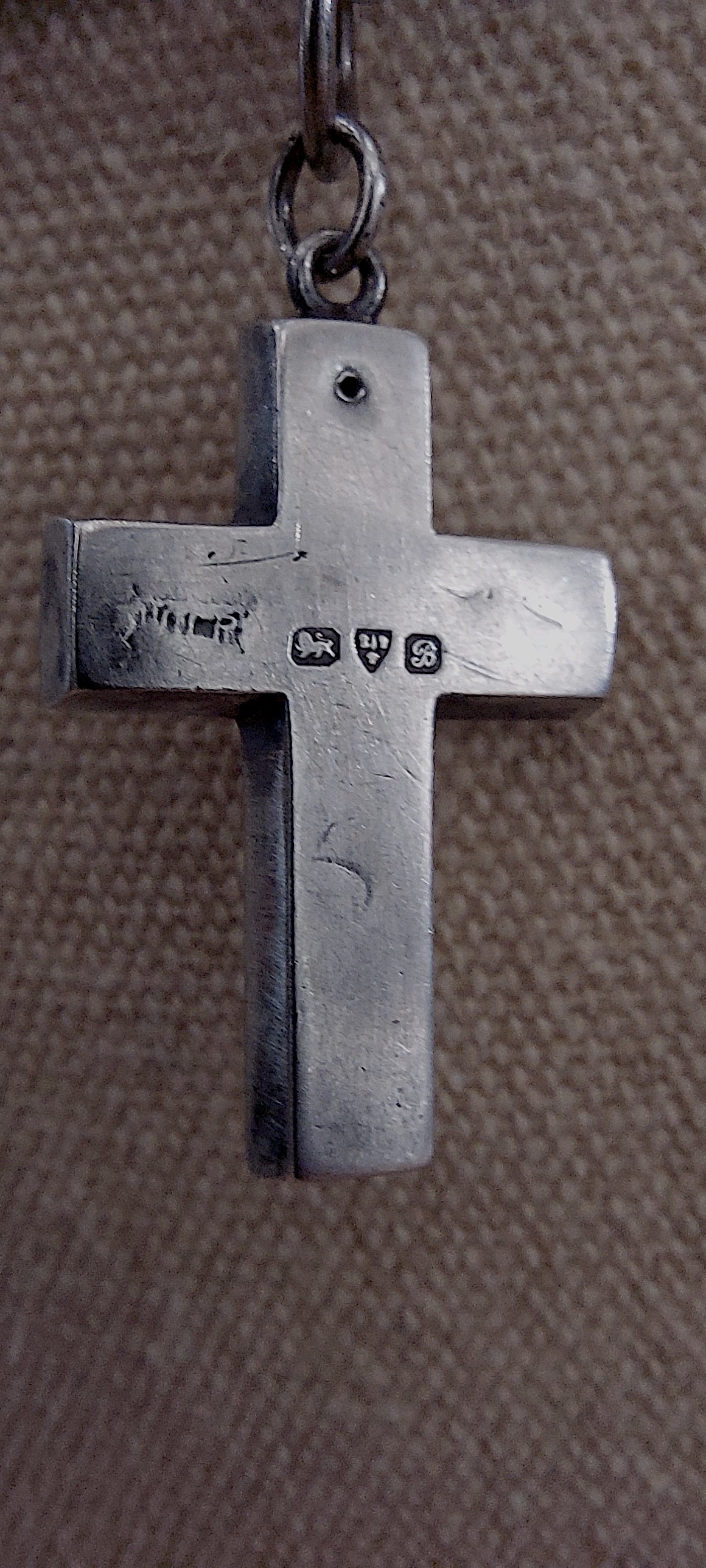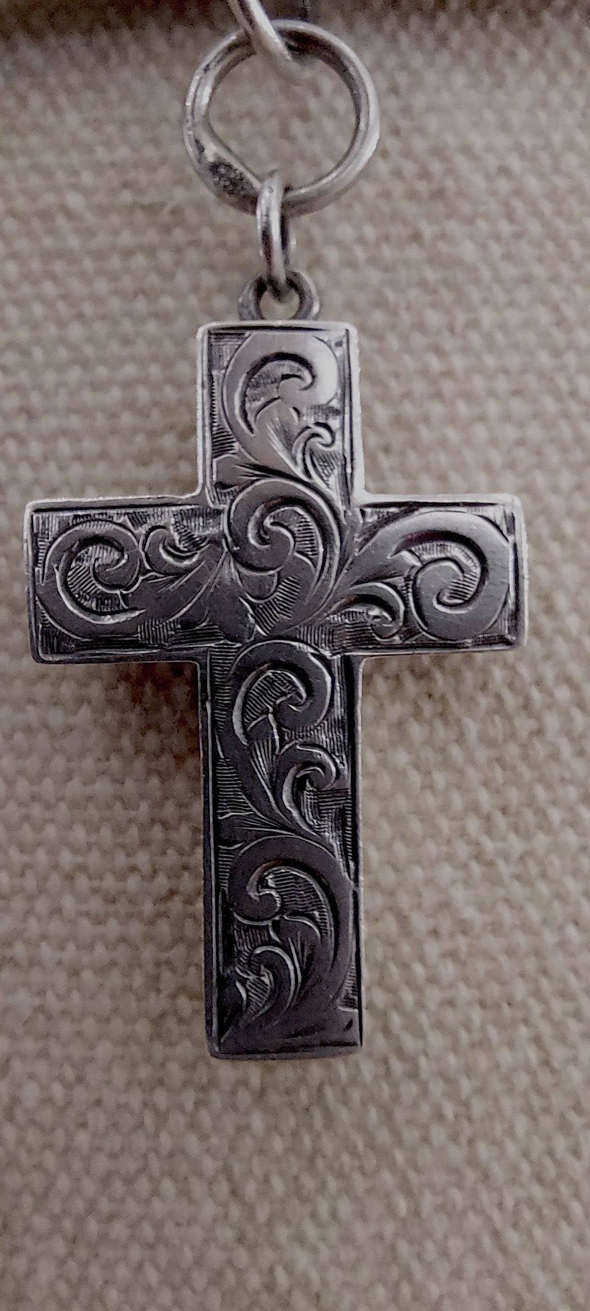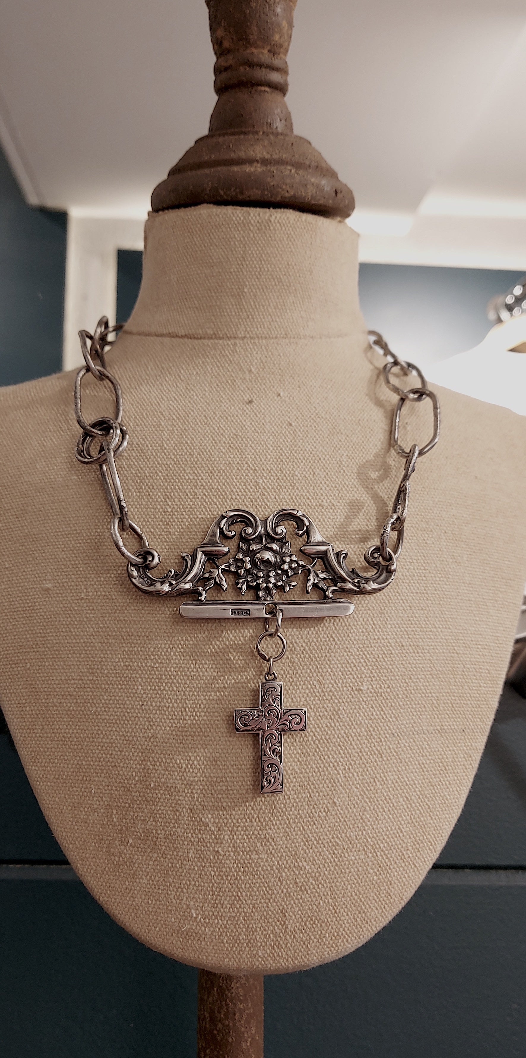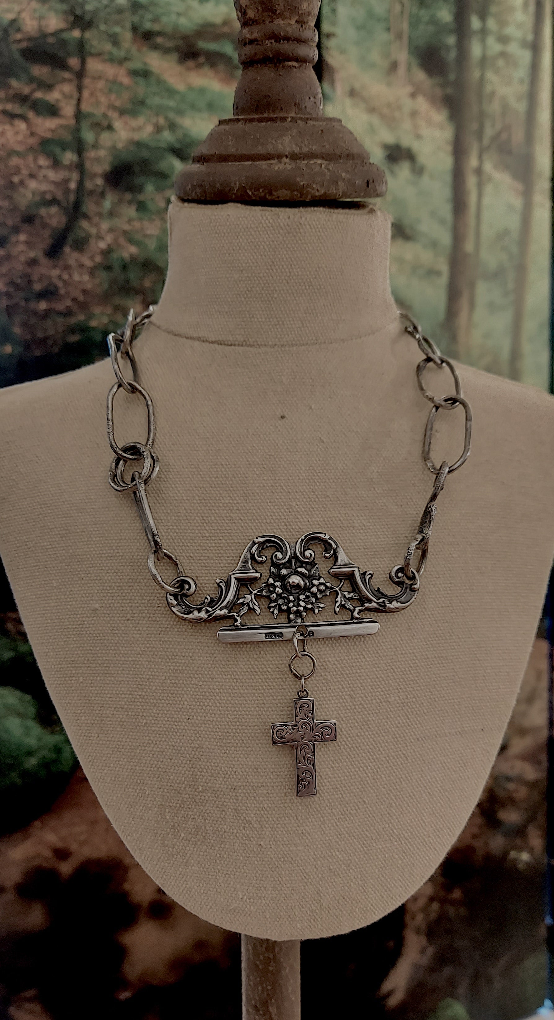 The centrepiece is an ornate, baroque style sterling silver panel, rich with swirling gothic scrollwork and floral detailing, reminiscent of an antique altar ornament. The silver is taken from an antique menu holder, hallmarked Birmingham 1906. Suspended from its hallmarked bar hangs a beautifully detailed cross pendant, hallmarked Chester 1902.